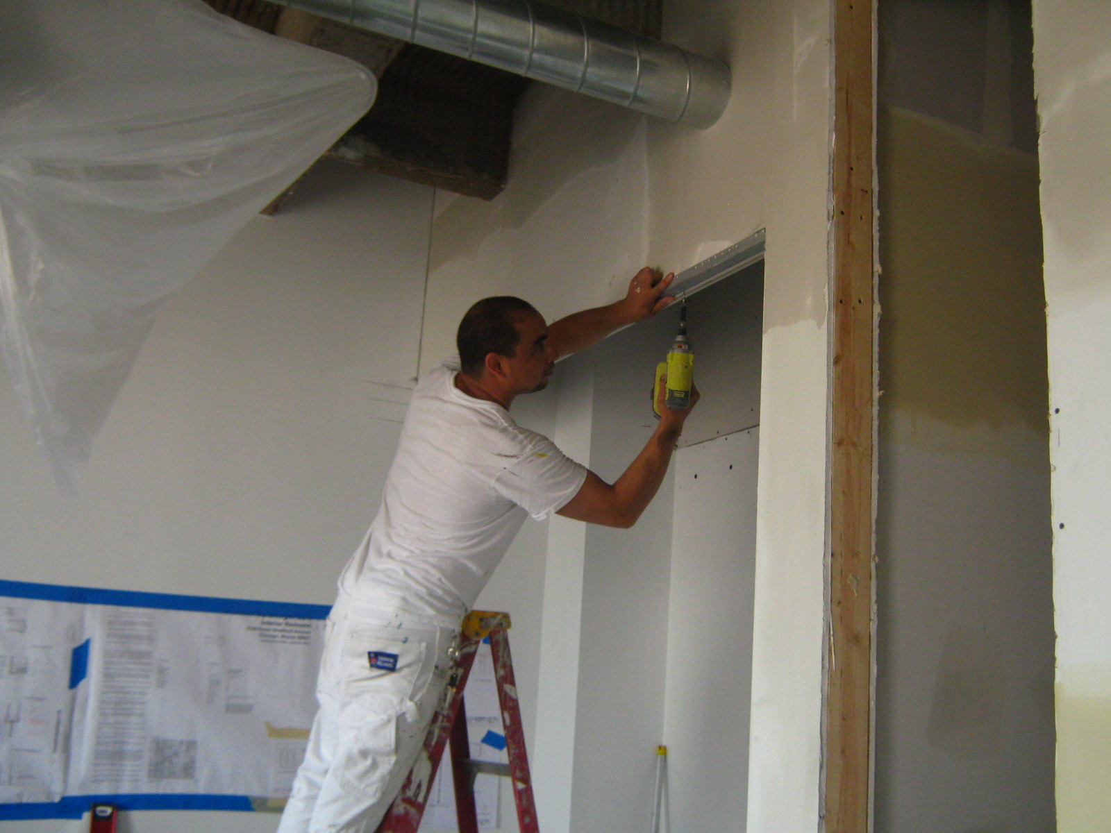 - Toto smooths out a piece of drywall to make it level.
