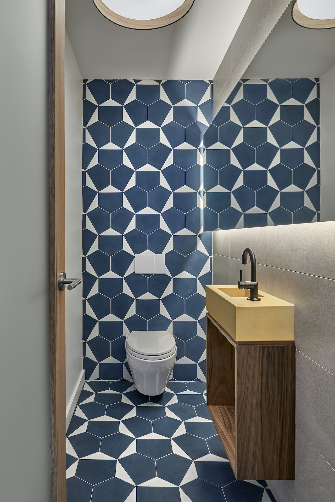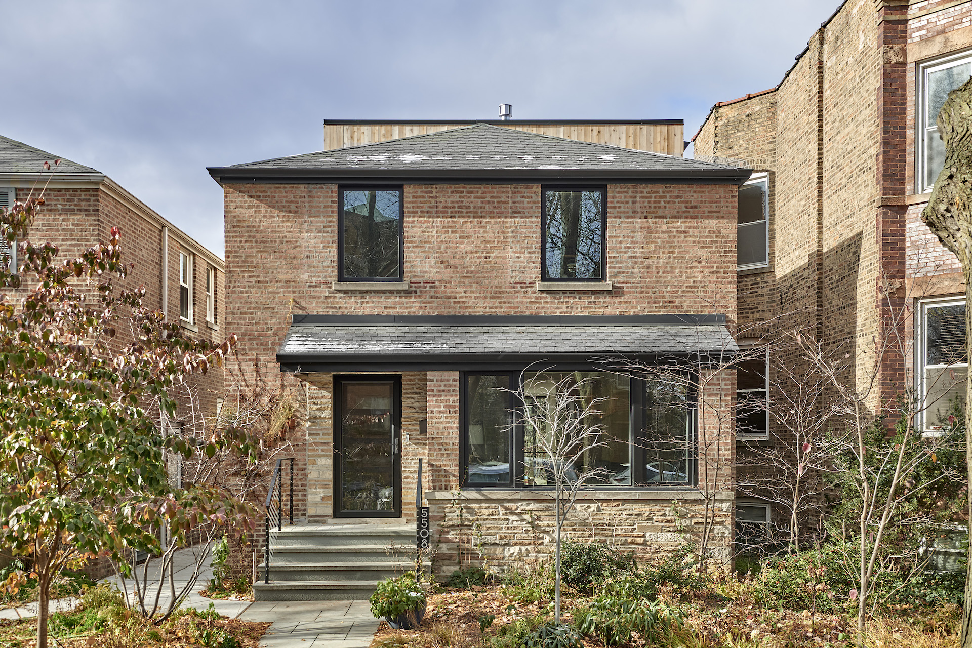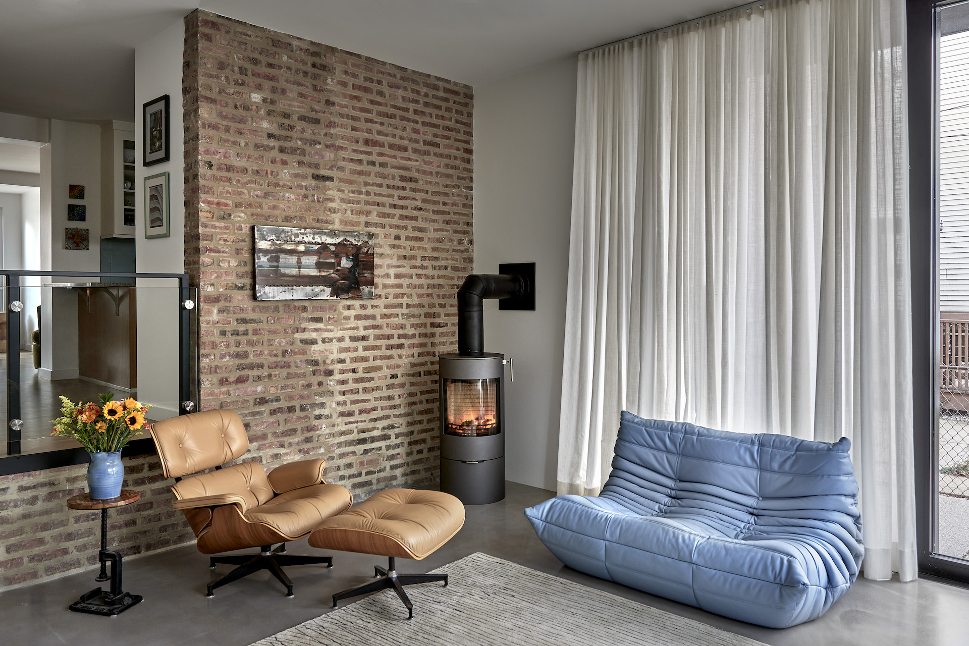 We maintained the original floor configuration at the front of the house to preserve the existing facade and its connection to the front. The entry, living room, kitchen, and powder room remain on the main level—then comes the defining feature: the split.